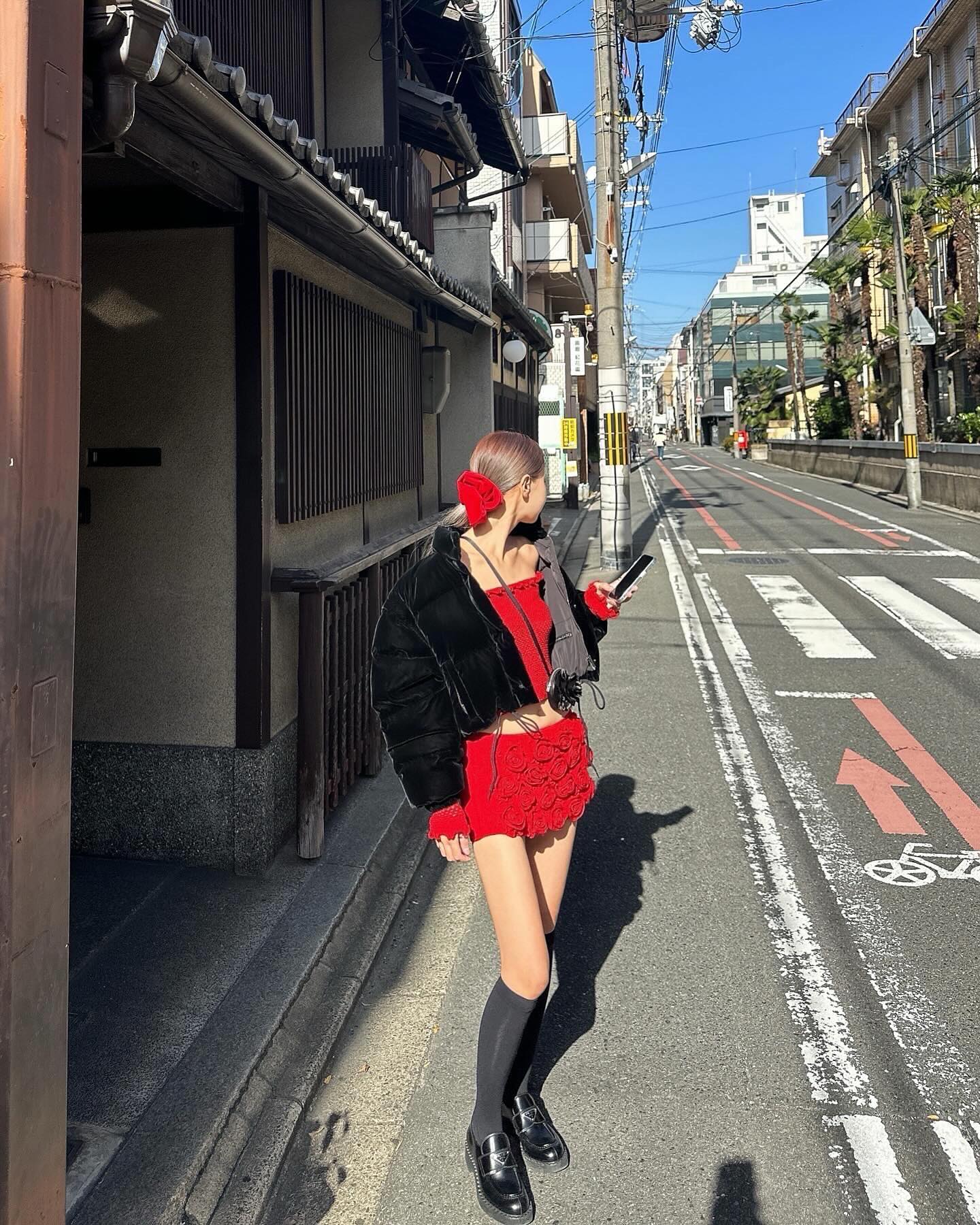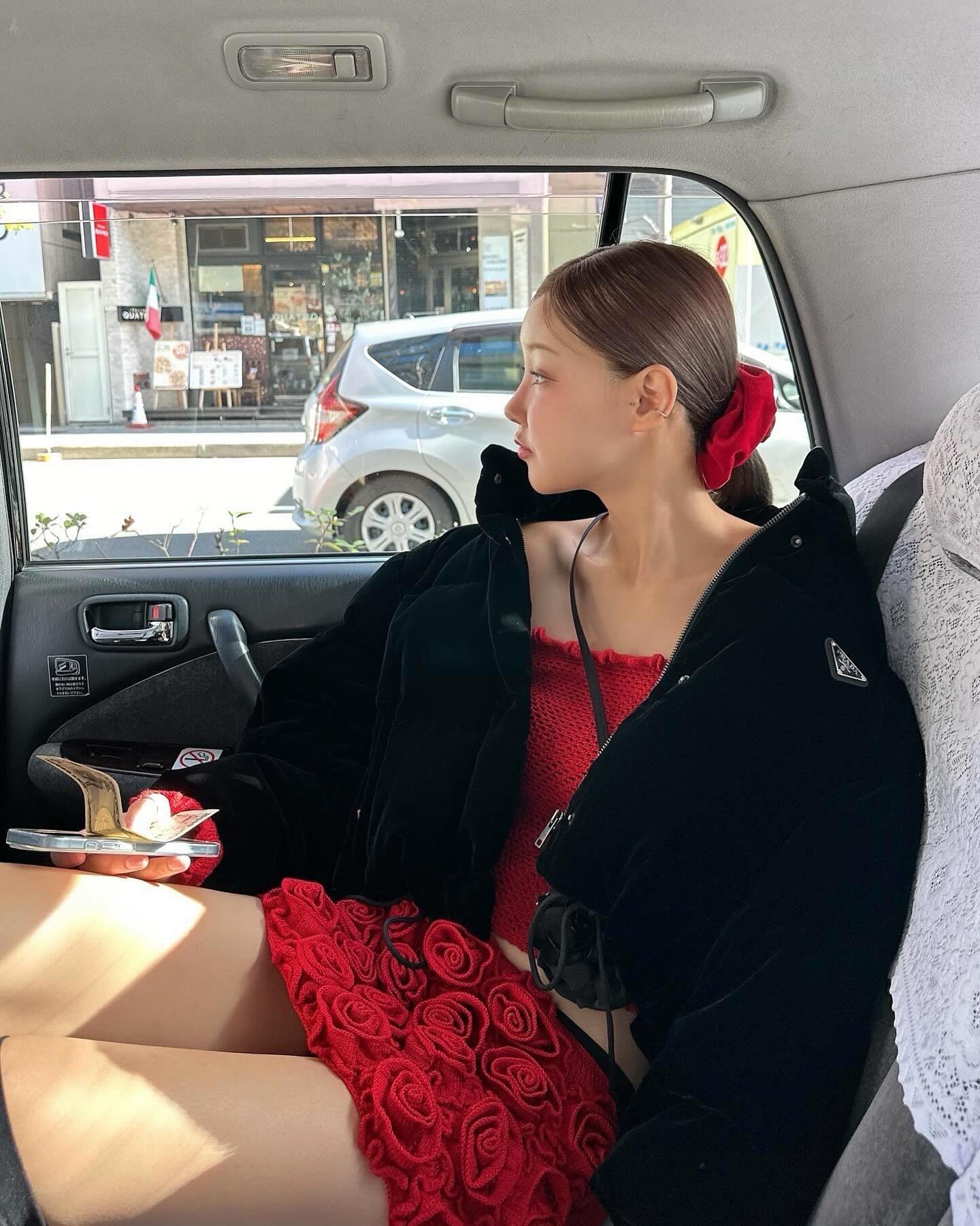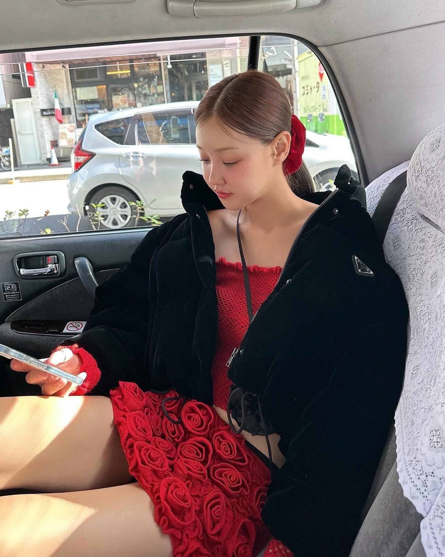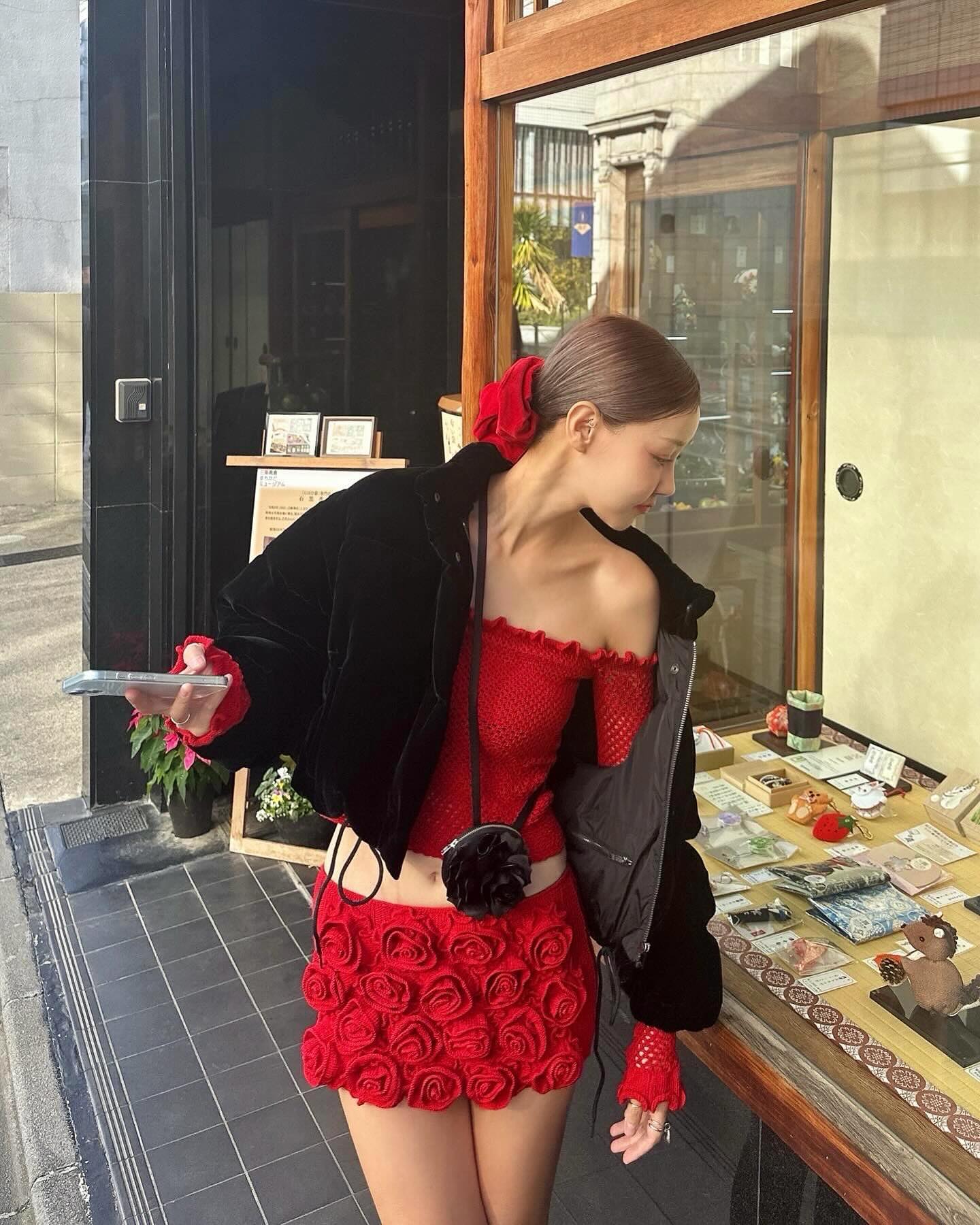 우아한 레드 로즈 디자인과 화려한 디테일이 돋보이는 숏 드레스 세트입니다.